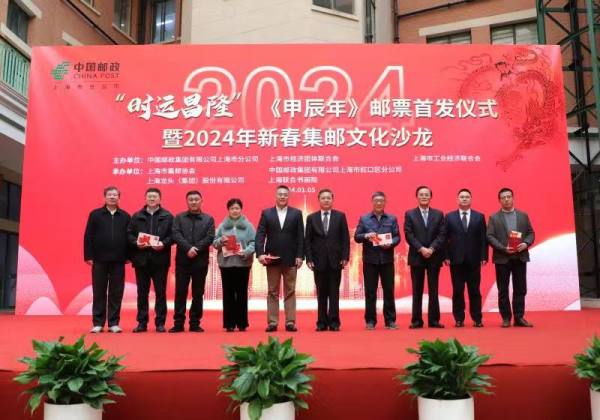 今天上午,结合生肖邮票发行主题,在百年邮政大楼内紧锣密鼓地举办了两场集邮沙龙活动,第一场是上海邮政联合上海市经济团体联合会、上海市工业经济联合会举办的时运昌隆”《甲辰年》邮票首发仪式,邀请市政协领导、书画艺术家、企业家和行业协会代表参加。第二场是2024年上海邮政新春集邮文化沙龙活动,邀请关心支持邮政业务发展的100位客户代表及合作伙伴参加,现场组织新品售卖和抽奖活动。两场活动均通过“中国集邮邮票百科”小程序全程直播。