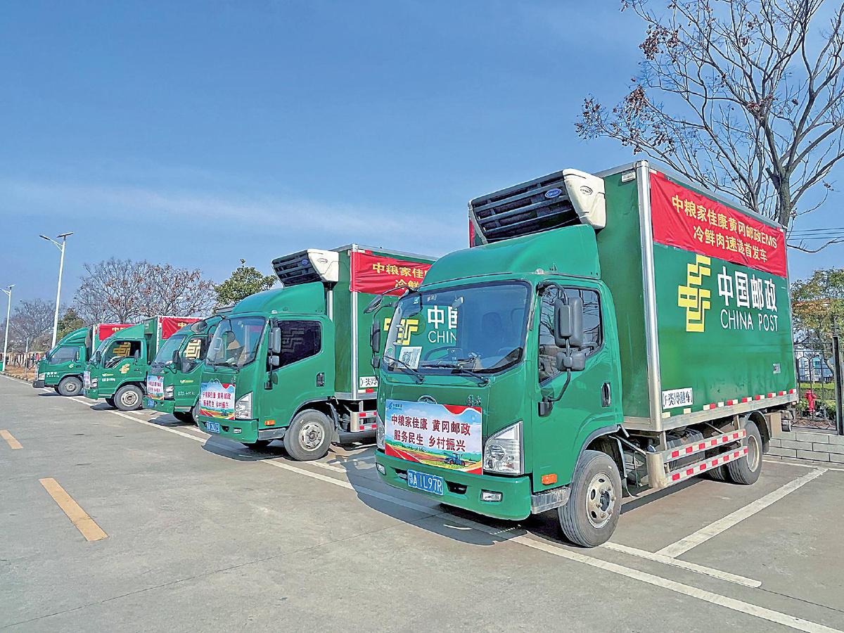 在黄冈市黄州区的中粮家佳康(湖北)有限公司园区,带有邮政标识的冷藏车依次排开。