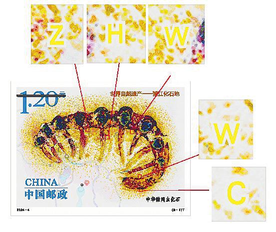 缩微文字也是这次工艺设计的亮点。“‘水哥’对缩微文字特别感兴趣,这是只有防伪印刷才能实现的精密印刷工艺。我们在票名里隐藏了‘澄江化石地’的拼音首字母,在每枚主票的化石周围隐藏了该化石名称的拼音首字母,这些有趣的彩蛋是我们送给集邮者的小惊喜。”原艺珊回忆道,“水哥”还曾设计了一组异形齿孔的草图,希望让异形齿孔以各种各样的海洋生物的形式呈现。但在讨论后发现,依照草图设计出来的齿孔在实践操作上会为邮票的印制和使用带来麻烦,因而优化成了更加适合操作的方案。最终呈现的异形齿孔是首次用两个异形针头组合成一个不对称的异形齿孔,设计新颖且契合邮票主题,令人眼前一亮。印刷色标也特意设计成海绵形状,主票加入海螺形的异形齿孔。原艺珊表示:“我们希望发挥邮票独特的工艺优势,让寒武纪生命大爆发的盛况跃然纸上。”