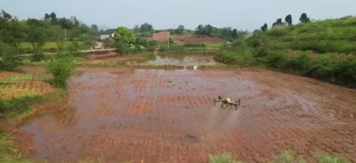 植保无人机撒下秧田除草剂。邮储银行重庆分行供图