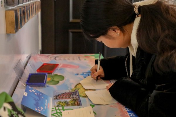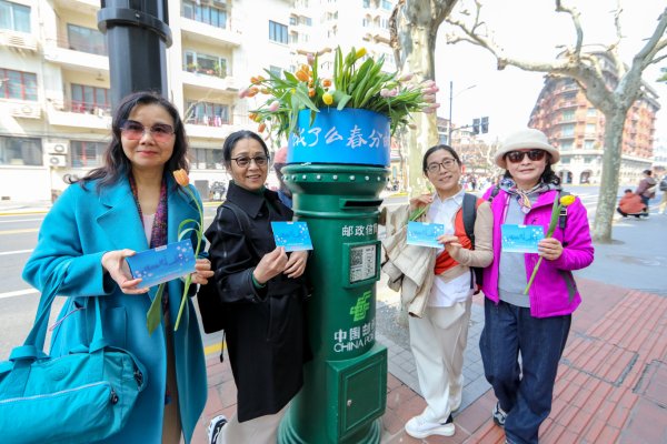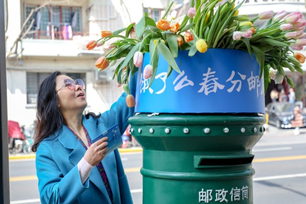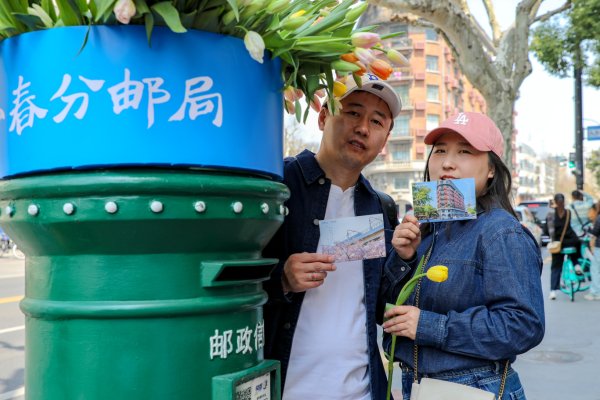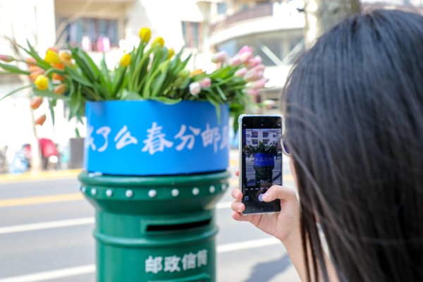 据悉,活动现场不仅设置有“明信片墙”,更是将绿色邮筒也打造成了春意满满的“郁金香花筒”,一时间吸引了众多市民游客打卡拍照,大家进入邮局后领取明信片进行书写、贴邮票、盖纪念戳、邮寄,用这种方式共同传递上海春日的美好。