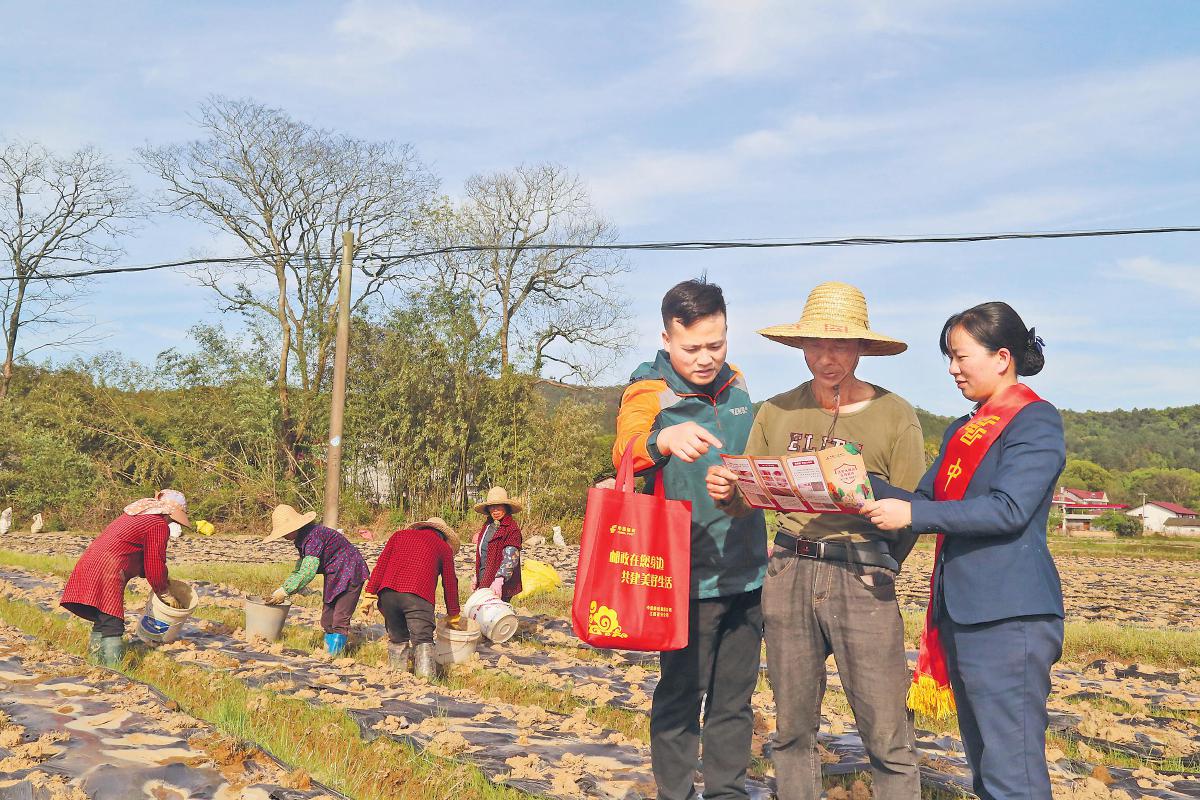 万安县枧头邮政所员工春耕时节走进田间地头,向村民普及金融知识。 □郭仙花 摄