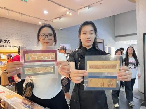 在陕历博丝路驿站主题邮局,两名从武汉来的“00后”大学生徐睿和李芷涵,也发现了惊喜。徐睿说:“我们是学艺术设计的,刚刚在楼上参观时,看到了难得一见的半壁仕女图,没想到在楼下就发现了仕女图的特种邮票。特别开心!”
