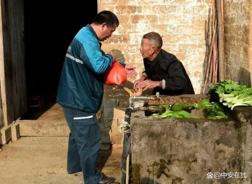 吴义阳(左)将代购的糯米送到老人手中。新华社记者 黄博涵 摄