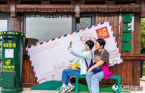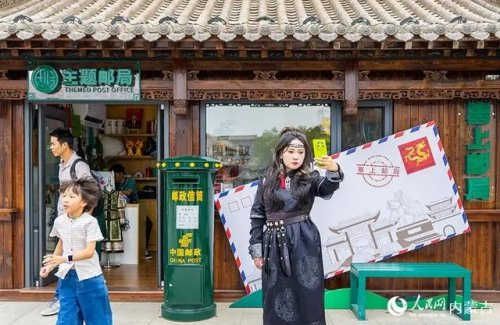 6月18日,来自广东的游客在呼和浩特市玉泉区塞上老街旅游休闲街区“塞上主题邮局”前留影。