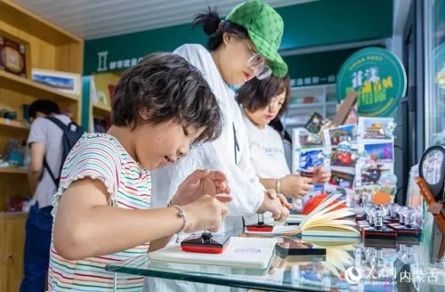 6月18日,来自福建的游客在呼和浩特市玉泉区塞上老街旅游休闲街区“塞上主题邮局”内参观、选购。