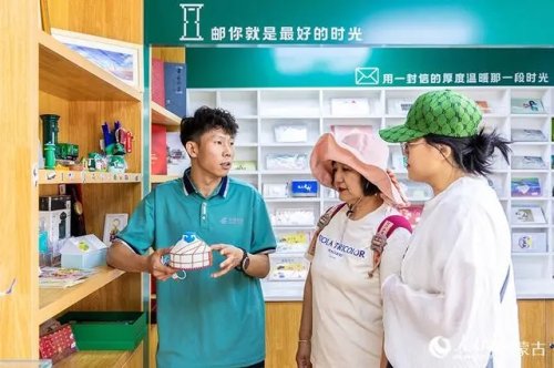 6月18日,工作人员在呼和浩特市玉泉区塞上老街旅游休闲街区“塞上主题邮局”内向游客介绍特色文创产品。