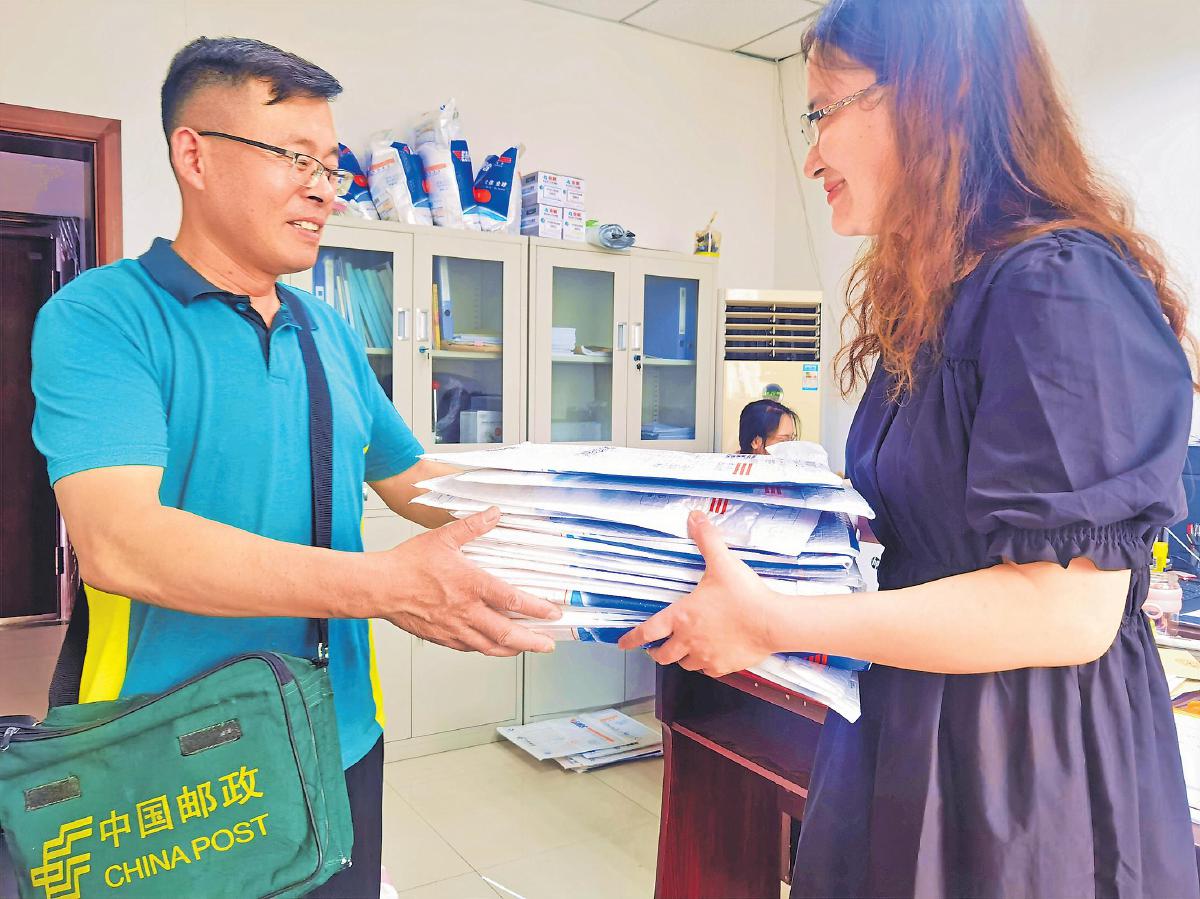图为7月11日,该分公司投递员将当日进口的高校毕业生档案投递到县人力资源和社会保障局人事档案室,与档案室工作人员做好交接、登记手续。
