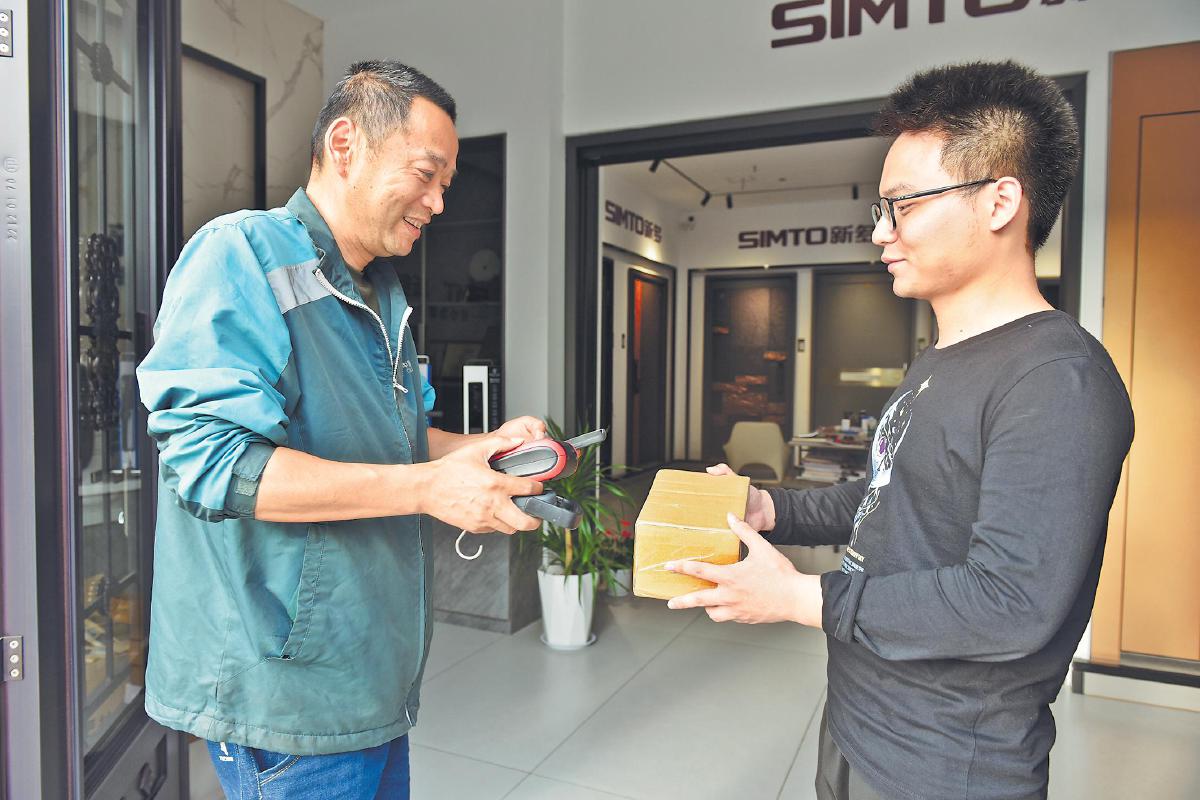 江苏省南通市海门区邮政分公司员工上门为客户提供退换货寄递服务。 □王欢 摄