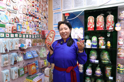 7月25日一大早,采访组一行到达位于中俄边境的满洲里第五代国门。在位于国门景区的入口处,占地200多平方米的满洲里国门主题邮局格外吸睛。进入主题邮局,映入眼帘的是各类多巴胺色的文创产品,其中一款“绿皮火车穿越国门”图案的冰箱贴凸显地标特色,尤其受到游客欢迎。该主题邮局负责人项欣说:“我们主题邮局里有邮品、文创产品、特色食品等500多种产品,以国门为主题的文创产品和鄂温克族手工艺品非常受游客喜爱。”