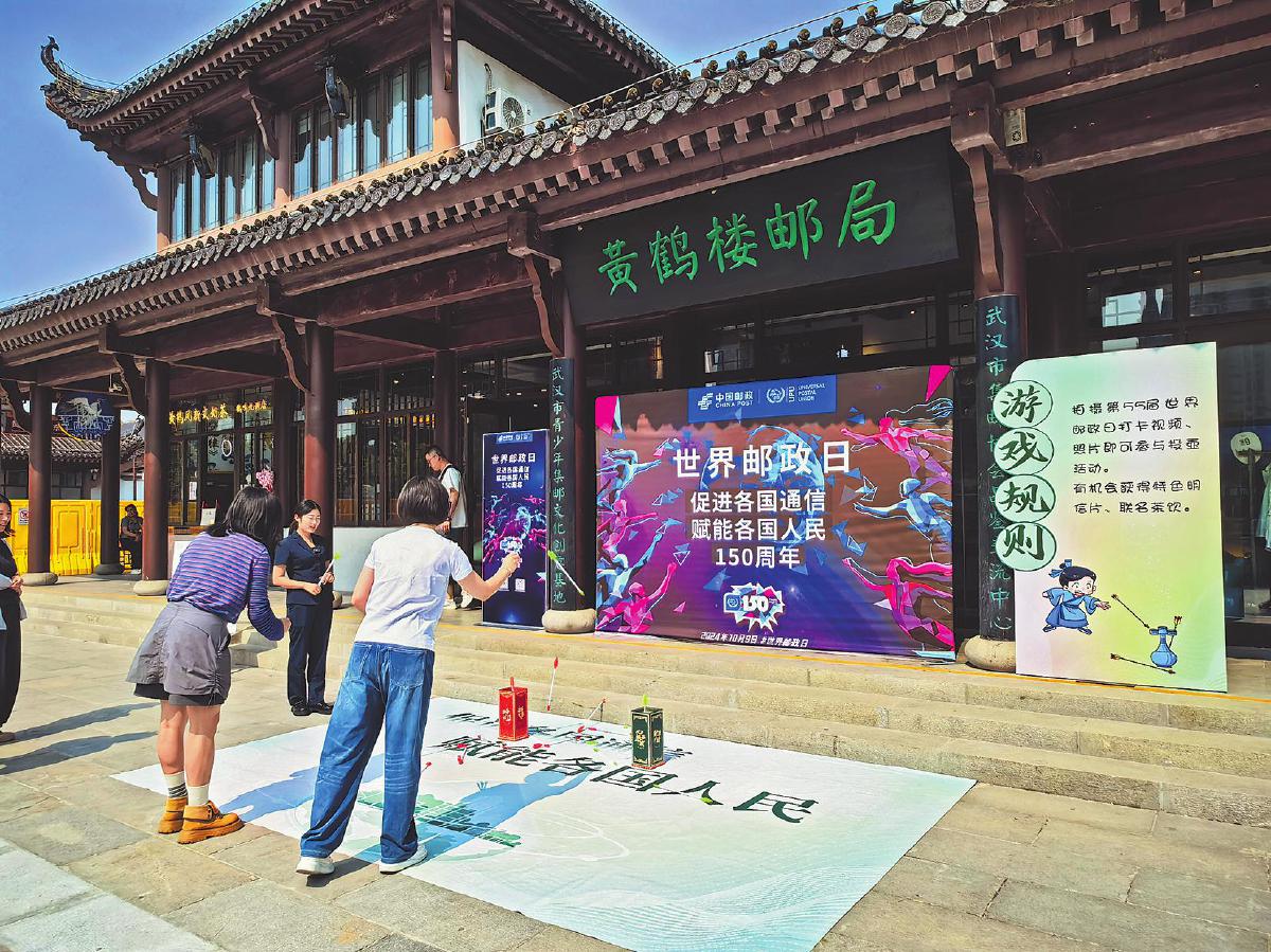 湖北省武汉市邮政分公司在黄鹤楼邮局、东湖高新政务中心以及全市各个邮政网点举办了形式多样的世界邮政日主题宣传活动。位于黄鹤楼景区东门的黄鹤楼邮局在世界邮政日当天开展了集戳打卡、趣味投壶、书画展示等丰富多彩的活动,吸引了不少市民和游客参与。 □肖芳 陈娟 摄