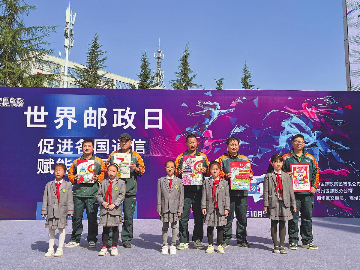陕西省商洛市邮政分公司举办世界邮政日宣传暨“童心同行 邮政相伴为美好生活加‘邮’”活动,来自商州区第六小学的5位小朋友现场为邮政快递员送上了精美的手绘作品。 □张潇 摄