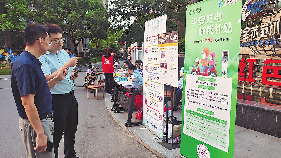 邮政员工为客户介绍充电优惠活动。