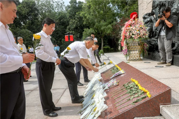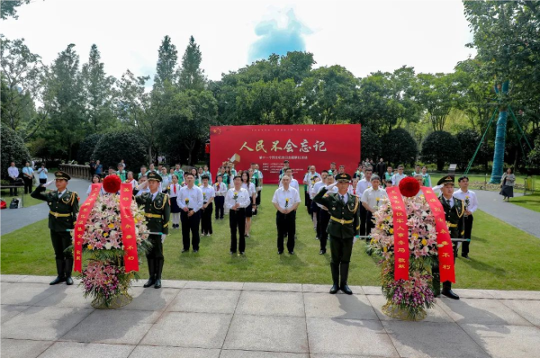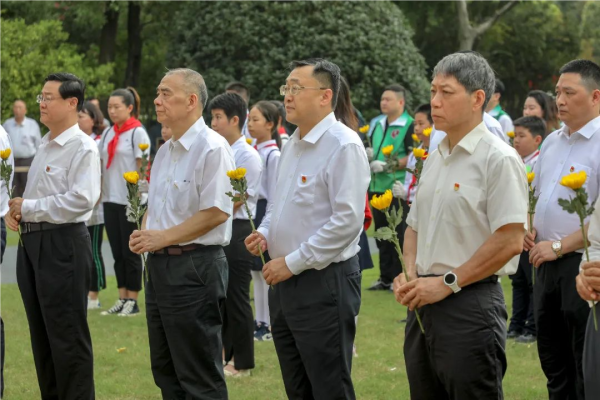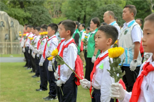△活动在《中华人民共和国国歌》中拉开帷幕,龙华烈士陵园礼兵向革命烈士敬献花篮,随后全场三鞠躬,向革命烈士致敬。