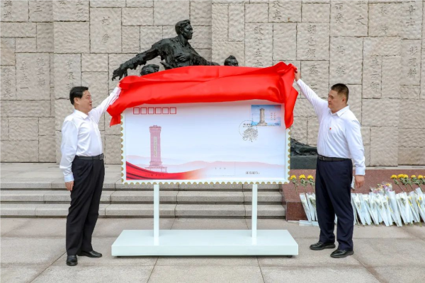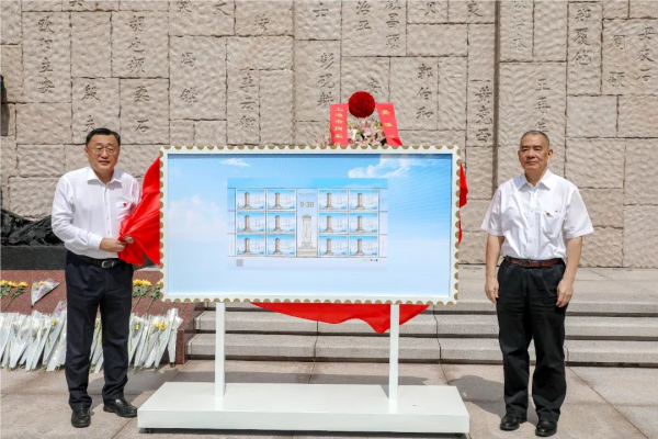 △上海市退役军人事务局副局长包尔基与上海市邮政分公司党委书记、总经理李柏平共同为《烈士纪念日》纪念邮票揭幕。