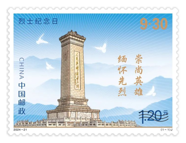 本次发行的《烈士纪念日》纪念邮票以人民英雄纪念碑为画面主体,结合“崇尚英雄、缅怀先烈”的重要指示精神,辅以白鸽、远山、光芒等元素,表达了对烈士的深切缅怀和崇高敬意,整体设计简洁、质朴、庄严,传递出“理想之光不灭,信念之光不灭”的深刻内涵。一版双雕的工艺设计与邮票设计相辅相成,邮票中巍然屹立的“人民英雄纪念碑”采用黑色雕刻,画面庄重、素雅;“缅怀先烈 崇尚英雄”文字及边饰纪念碑采用金色雕刻,既衬托邮票主体,又丰富邮票整体版面效果。
