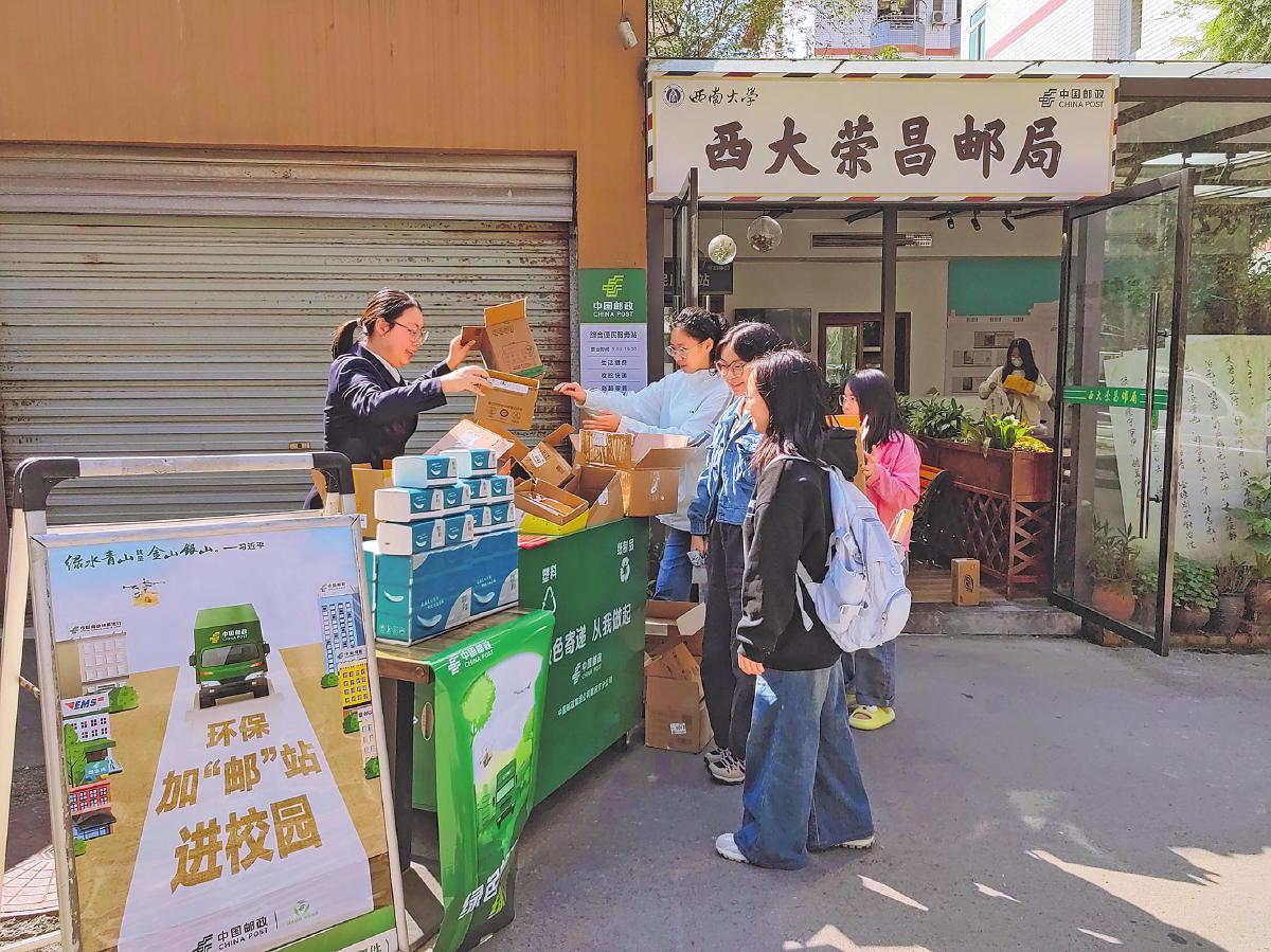 重庆市荣昌区邮政分公司开展“环保加‘邮’站进校园”活动,参与者可用旧纸箱换取奶茶一杯。