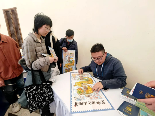 由上海市邮政分公司特别为本次邮展设计的“龙邮方寸天地间”打卡导览图一图难求。正面一条祥龙腾空而起,穿越祥云,在上海市花白玉兰的掩映下,每一片龙鳞都是一个盖章处,分别对应《陋室铭》中的一个字,观众按导览图的指引,一边逛展馆一边集字戳,最终可集齐一篇“有龙则灵”的古文佳作。你确定不去领一张?