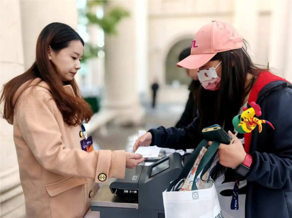 在现场寄递点,10个台席一字排开,收寄集邮爱好者寄出的邮品。各种要实寄的封片,寄!买多了不好带回家的文创,寄!考虑集邮爱好者对日戳时间的要求,静安区分公司还在外场设置了15个台席,确保当天收寄的邮件全部准时发出。