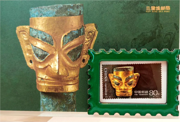 印着三星堆金面罩头像的三星堆邮票冰箱贴
