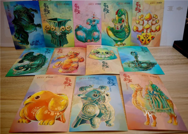 国博主题邮局《萌萌国宝》明信片套装,收录四羊青铜方尊、击鼓说唱俑等12件镇馆珍宝