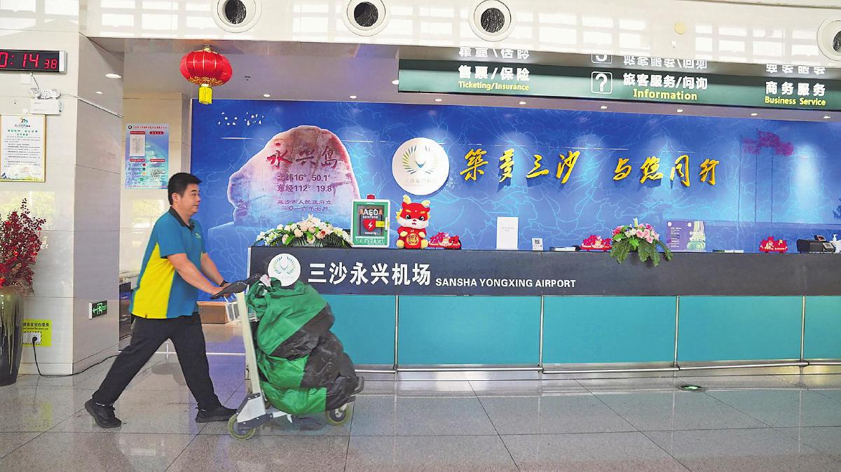 2024年12月27日8时32分,随着海南三沙公务包机HU7071航班的顺利起飞,其搭载的EMS特快邮件被送往三沙永兴机场。40分钟后,飞机平稳降落。随后,三沙邮政驻永兴岛工作人员在10时10分提取邮件,并立即进行分拣和投递。三沙航空邮路在延续原有报刊运送服务的基础上,新增EMS特快专递邮件运送,为驻永兴岛党政部门和军民提供了更加多样化和便捷化的邮政服务。2025年,三沙邮政将进一步提升服务水平,为建设美丽三沙贡献更大力量。图为三沙邮政驻永兴岛工作人员在永兴机场提取邮件。