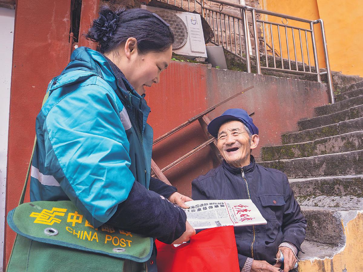 1月17日,重庆市武隆区邮政分公司投递员穿越严寒给客户送上党报。 □王金庄 摄