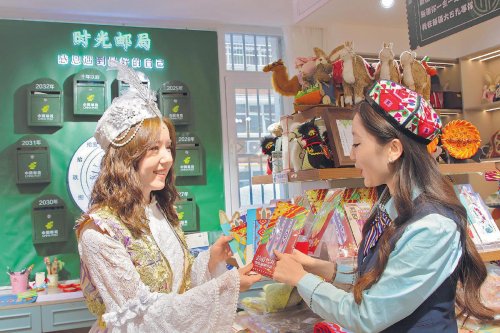 走进大巴扎主题邮局,琳琅满目的文创产品吸引了众多游客驻足观赏、购买。整面墙的新疆风光明信片和醒目的“时光邮局”4个字最先抓住游客的眼球。来自全国各地的年轻人将对未来的期待、对生活的感悟、对亲人的思念,写在信纸上装入信封,投入“时光邮局”的信箱,寄给未来的自己,充满仪式感。