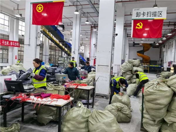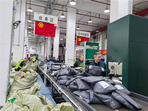 商企业务分公司金兴集中收寄点承担商企及金山区域内各区分公司就近揽收邮件的收寄、集包和汇集驳运功能,12月9日-12日,累计收寄邮件59.3万件,收寄峰值17万件/天,利用自动化分拣设备提升处理效能,效率达13000件/小时,前置集包12895袋55.2万件,全力确保旺季邮件处理时限和客户体验。