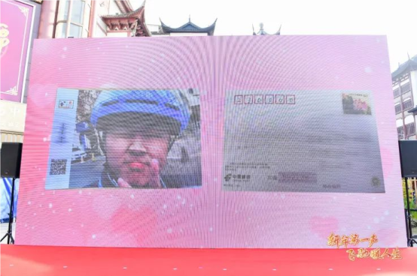 △饿了么顺昌路站点“00后”小哥代表李帅现场展示有声明信片,通过明信片传递了对父母的感恩和感谢。新就业群体彩笺传情,向家人送出了2025年的第一声祝福。