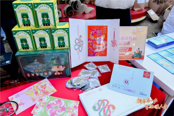 当天,南市邮政支局的青年骨干们也积极投身于活动之中,在现场参与集市设摊活动。蛇年生肖贺卡明信片琳琅满目,散发着浓厚的文化气息,集邮文创产品更是吸引了众多目光,成为现场的热门焦点。此外,现场还提供了代理金融、乡村振兴农产品销售等多元化便民衍生服务,为活动增添了丰富的色彩与活力,吸引了现场人群纷纷驻足咨询,在互动交流中传递着邮政的温暖与社会责任。
