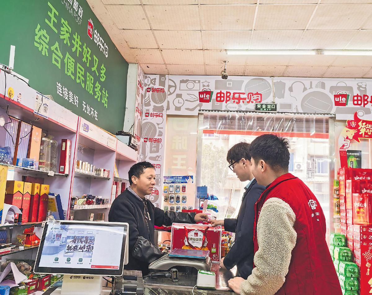 诸暨邮政网点管理人员在王家井好又多综合便民服务站巡店,并与掌柜交流业务开展情况。
