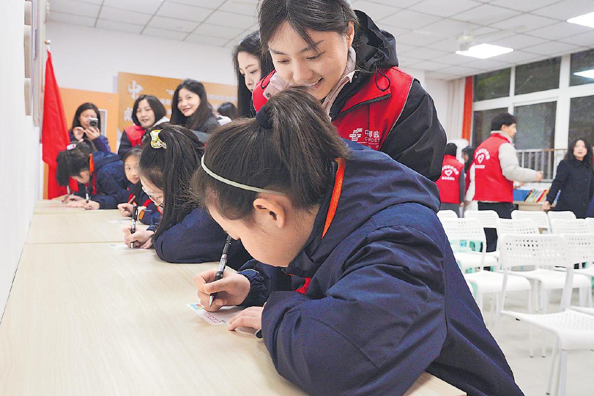 少年邮局内,重庆邮政青年志愿者指导小朋友书写明信片。