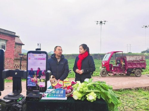 “这飞机还挺大。”“一架能装多少?”循着周遭居民热烈的议论声抬头望去:6架无人机接力飞行,将收砍的青菜头从田间运送到路旁的邮车上。在这场涪陵片区邮政分公司与涪陵区农委组织的“涪陵青菜头新鲜到家”主题助农惠民直播专场活动中,首次出动了无人机,通过“无人机运输+网络直播”,助力农产品快速出村进城。