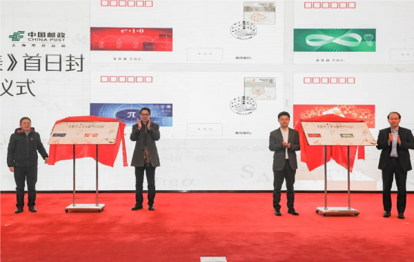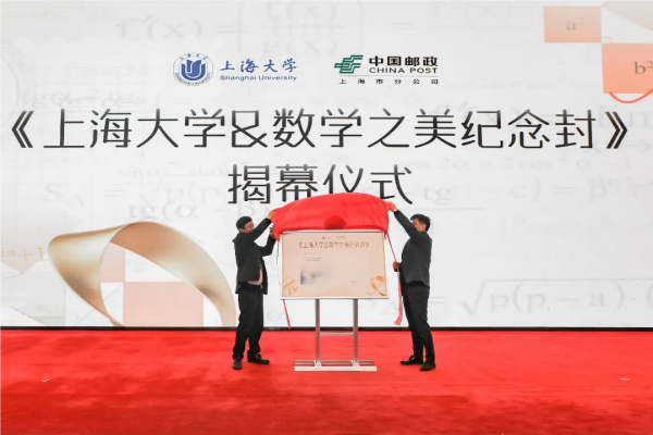 △上海市邮政分公司邮务部总经理朱顺军与上海大学理学院党委副书记、常务副院长张登松共同为《上海大学&数学之美纪念封》揭幕。