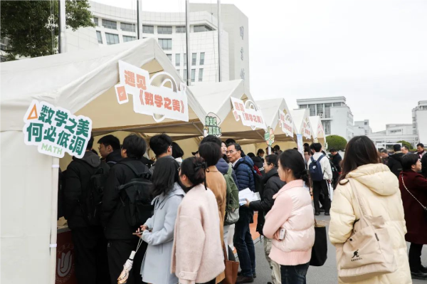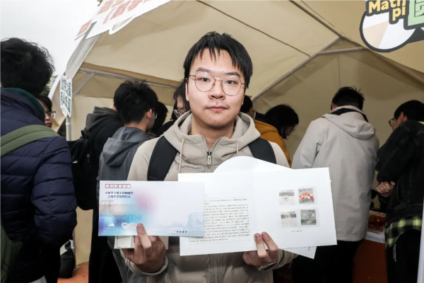 在首发活动现场可以看到,场外的广场上也是热闹非凡,邮政展台前排满了前来购买邮票的师生和特地赶来的邮迷们。大家井然有序排着长队,纷纷购买本次首发的《数学之美》特种邮票、纪念封、系列文创、加盖邮资机戳,一派热闹的场景。面对镜头,家住宝山的市民林老先生显得兴奋不已:“我今年67岁,集邮30年了,看见今天在上海大学有这套邮票的首发,因为离家不远,所以特意早早赶过来!”