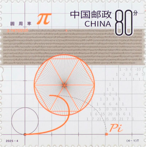 第一枚“圆周率”作为广为人知的数学常数,贯穿于几何、物理等众多学科。邮票元素包含了π的本质定义,以极细线表现早期经典割圆法,并将圆周率小数点后996位以缩微文字的方式呈现于画面,特别通过橘色设计突出前7位,纪念我国南北朝时期数学家祖冲之。