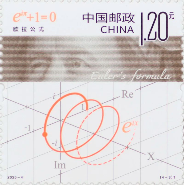 第三枚“欧拉公式”(eiπ+1=0)被誉为“数学中最美的公式之一”,邮票以图形的方式表现了欧拉公式将数学中5个重要常数(e、i、π、1、0)联系起来。欧拉之眼图案部分采用缩微工艺,将这5个常数与防伪技术相结合。