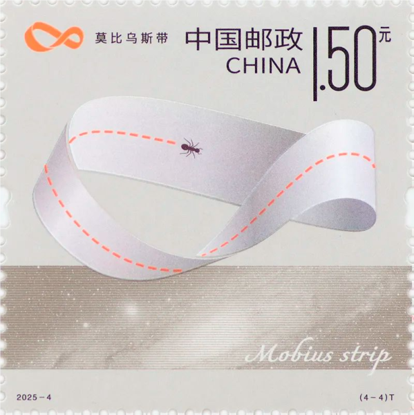 第四枚“莫比乌斯带”作为一种神奇的拓扑图形,只有一个面和一条边界。邮票采用局部烫印工艺,丰富的色彩变幻更好地呈现莫比乌斯带的多维性质。在紫外光照射下,蚂蚁的足迹和画面下方的银河相呼应,寓意着从微观逐步扩展到更广阔的宏观领域。