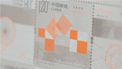 第二枚“勾股定理”是中国古代几何学的成就之一。它给出了直角三角形三边的长度关系,即任意一个直角三角形的两条直角边长度平方之和等于斜边长度的平方。邮票在局部采用烫印工艺,以分层的视觉形式展现了证明过程。