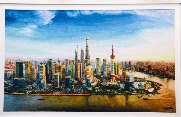 这枚邮票上的图案《浦江朝晖》就是装裱在人民大会堂上海厅的大型上海绒绣艺术壁画。