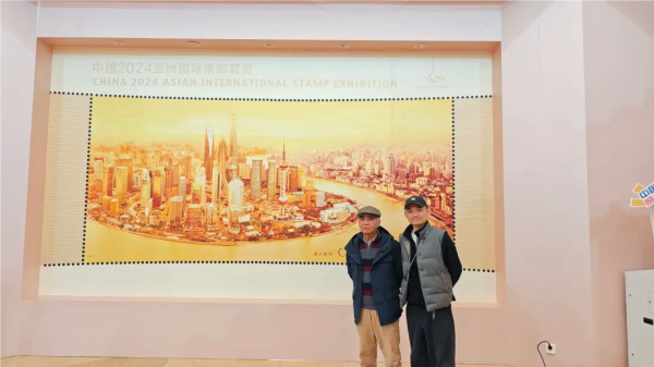 (包炎辉父子在亚邮展《浦江朝晖》小型张展示墙前合影留念)