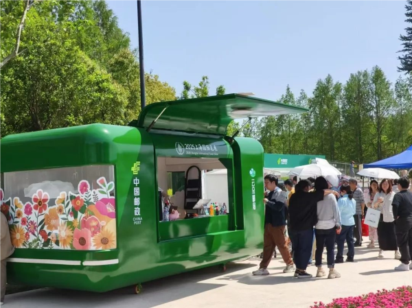 在钱家滩路(前滩公园巷段)限时步行街举办的前滩花集和早春非遗生活节期间,浦东邮政在新自然主义花廊旁特别设立了花展快闪邮局。为了庆祝此次花展,浦东邮政推出了限定版花展定制明信片和彩色邮资机戳,为本次花展增添了一份特别的记忆点。这一独特的邮资机戳不仅是对本届花展的美好祝福,也为广大集邮爱好者提供了一次难得的收集机会。花展快闪邮局特制了个性化邮差宝贝邮筒,造型独特,充满趣味,与现场的自助冰箱贴打印机、有声明信片打印机一同成为活动现场的一大亮点,游客纷纷驻足打卡。快闪邮局引入云朵主题邮局的云南咖啡,进行现场制作,让来往行人驻足品味的同时,感受到来自远方的温暖问候。现场还提供了丰富的明信片系列和邮政文创产品。