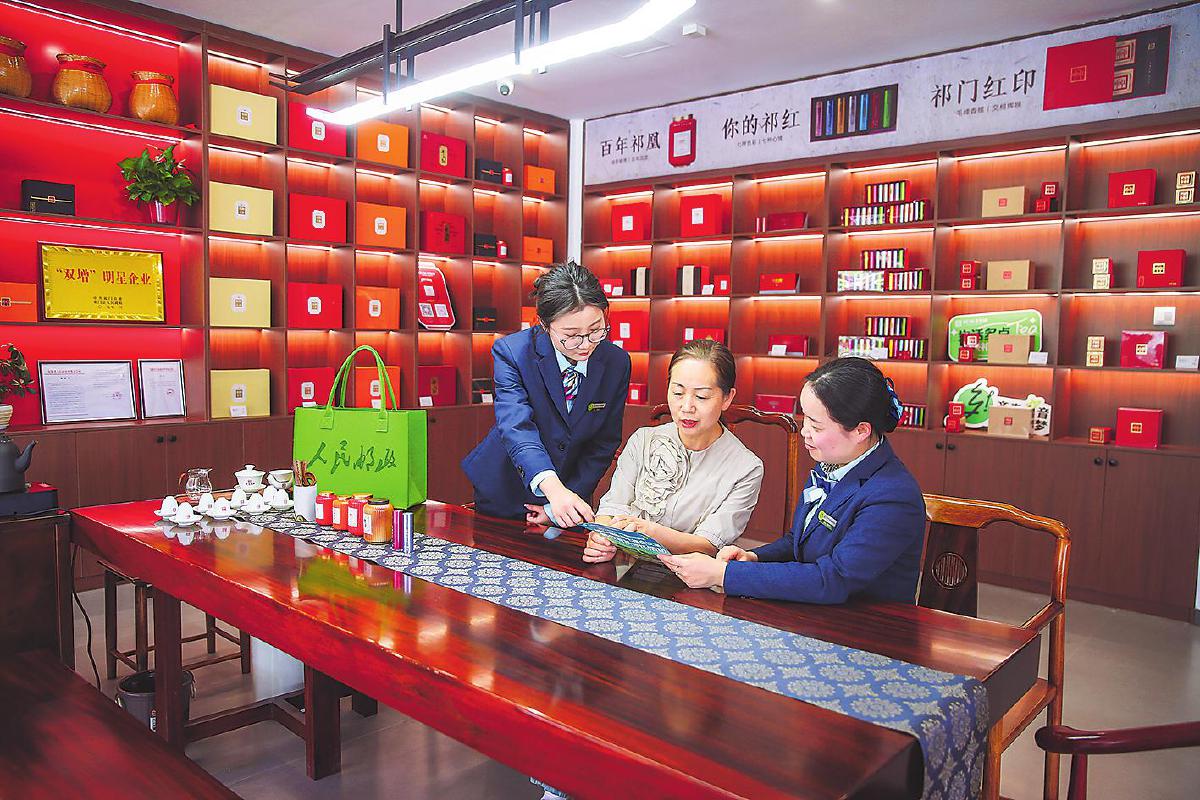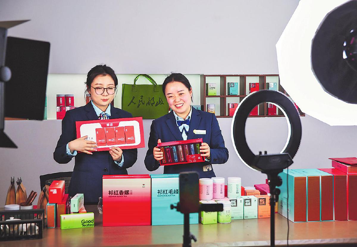 祁门县邮政分公司员工开展祁门红茶溯源直播。□徐雷 摄