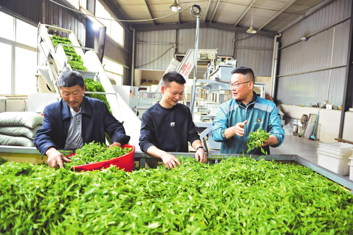 邮政员工与茶农交流,共话春茶好收成。□徐雷 摄