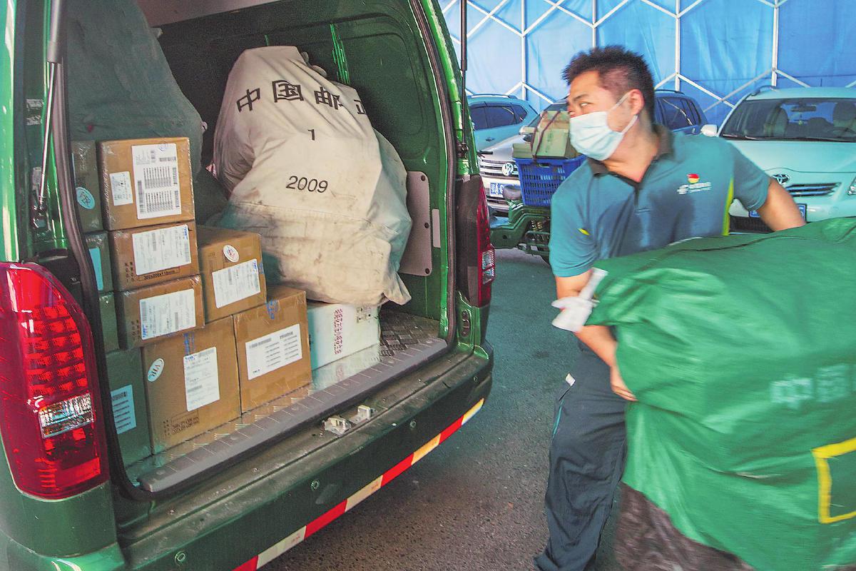 徐龙将邮件装进邮车。