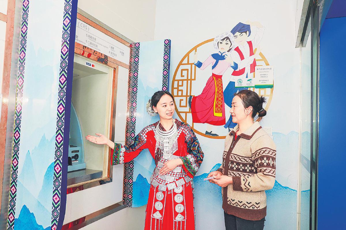 濯水镇支行员工身着土家族传统服饰为客户服务。