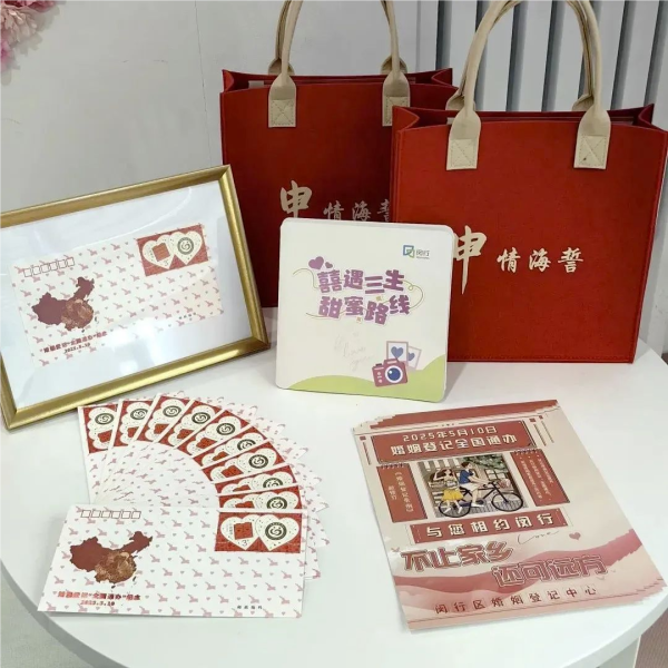 囍上加囍,闵行邮政携手区民政局倾情打造邮爱驿站,并推出“幸福三件套”。