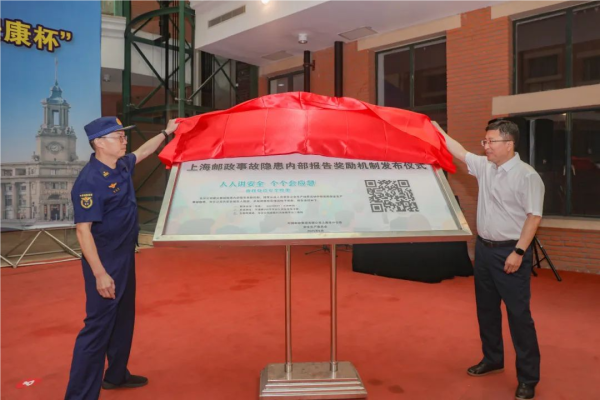 △市分公司纪委书记侯瑛与虹口区消防救援支队副支队长陈光宏共同为上海邮政事故隐患内部报告奖励机制正式揭幕。
