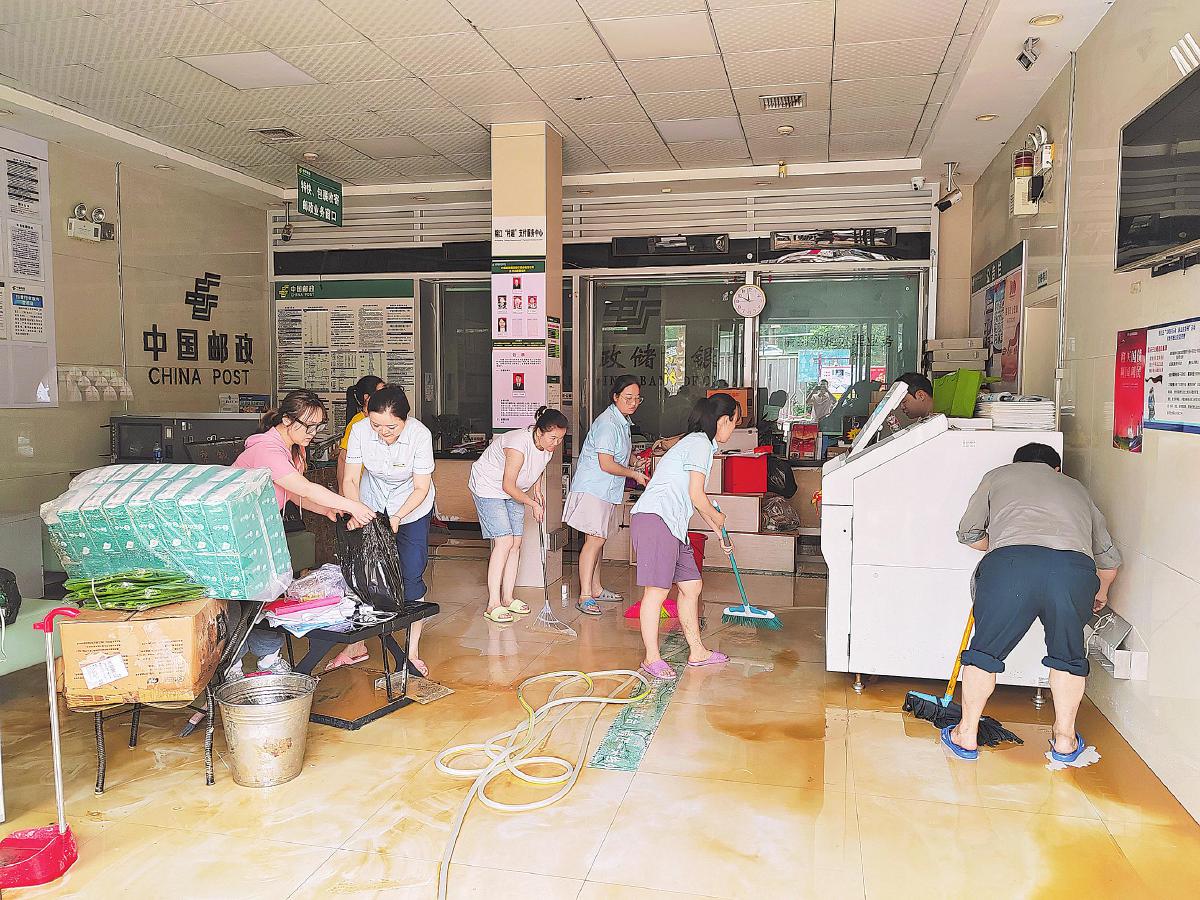 洪水退去,古州北路营业所员工抓紧清扫大厅,准备恢复营业。